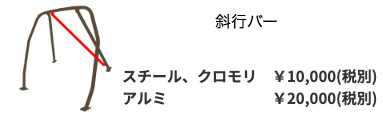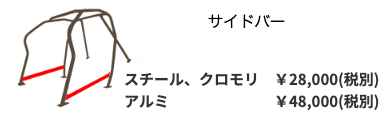 - 追加オプションの金額は、基本となる4点式、もしくは6点式のロールケージと同素材で作成した場合の金額です。追加オプションが別素材の場合(基本構成がスチールorクロモリで追加オプションがアルミ等の場合)上記の表とは金額が異なりますのでお問い合わせください。